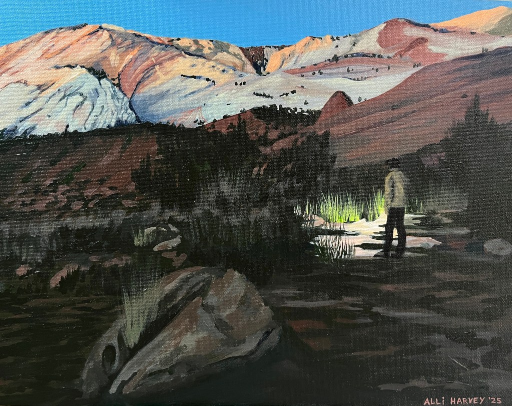 These are not necessarily my objectively “best” (you tell me), but these are the paintings that exemplified or taught me something. First, “Playa Sunset 1” (because I’m sure there will be more), pictured above. I sat down with my easel outside to paint this relatively quickly, in an effort to produce a series of $100-ish paintings by request for a Reno-area shop. While I was unable to produce paintings worth $100 while still honoring the time I put into each – I can’t help myself, and it’s part of what I enjoy about painting is getting at the detail – this painting taught me to keep my hand and focus moving and fluid. It felt like flow, which is fun! I learned that minimizing time spent on a painting can create a good kind of pressure in which I don’t pause too long and find myself needing to get un-stuck.