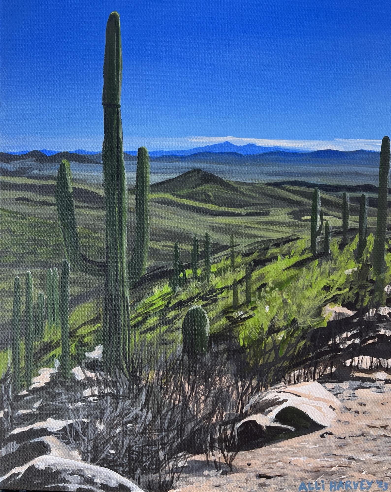 I paint to focus my attention and yours on seemingly everyday moments we might not otherwise see. No matter how many times I look, it feels like there’s nothing everyday about the otherworldly sentinels defiantly pushing toward the sky across the Sonoran Desert: Saguaro Cacti, of course. But what can be easy to miss are the striking colors and life across this landscape. I painted this piece to hopefully unlock – in me and you – the ability to notice, just a little more readily.